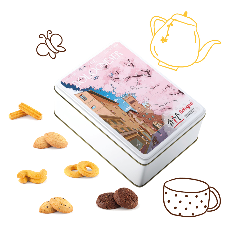 Biscotti assortiti di pasticceria Palmisano, contenuti in una latta personalizzata per AIL Bologna.